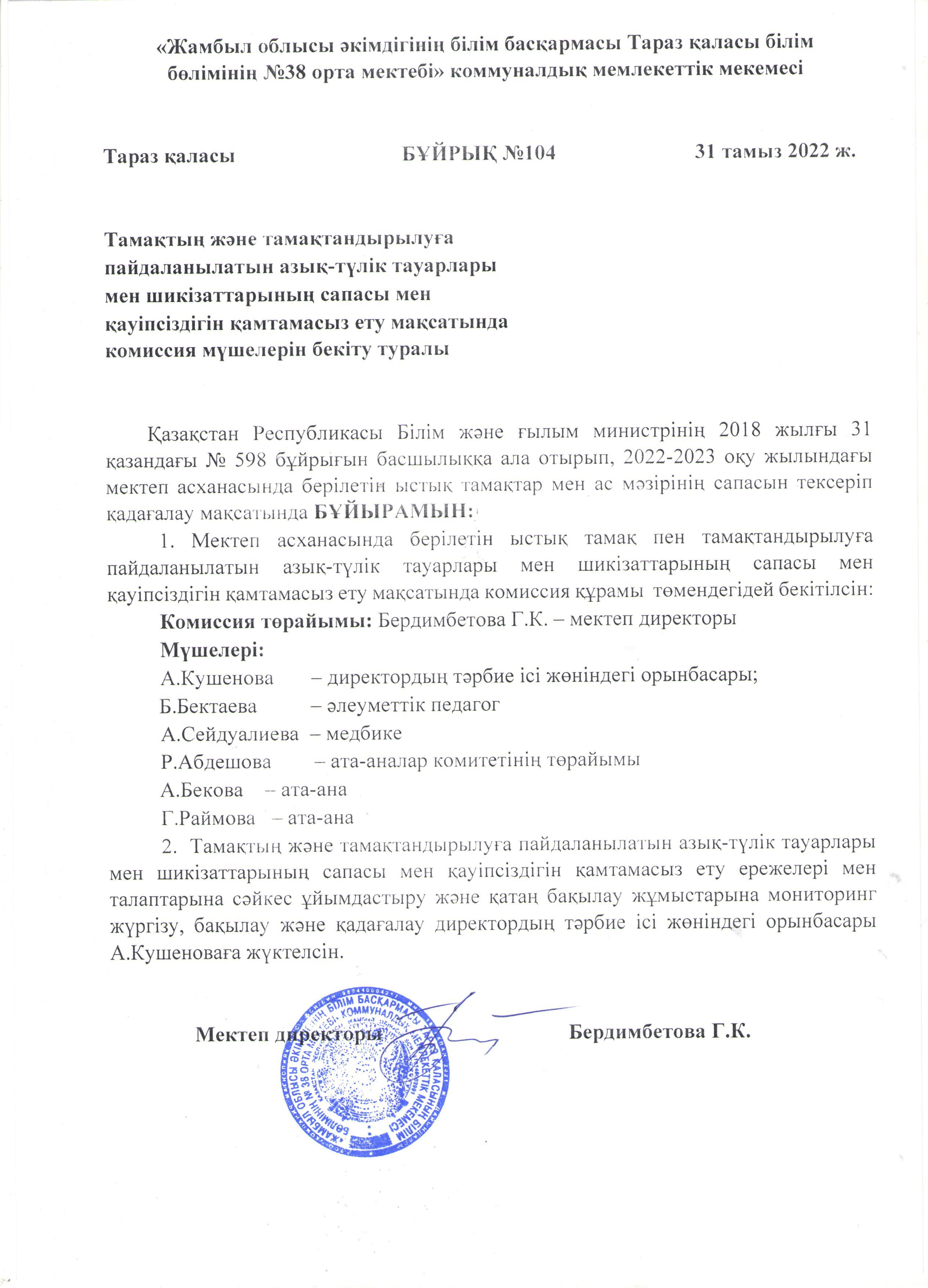 СШ №38 » Тамақтандыру » Тамақты және тамақтандырылуға пайдаланатын азық-түлік тауарлары мен шикізаттарының сапасы мен қауіпсіздігін қамтамасыз ету мақсатында комиссия мүшелерін бекіту туралы